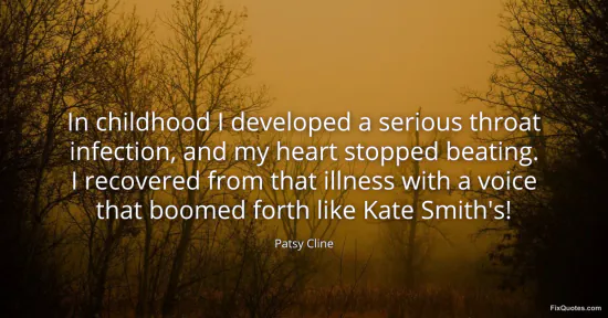 Cline, Patsy. (2026, January 17). In childhood I developed a serious throat infection, and my heart stopped beating. I recovered from that illness with a voice that boomed forth like Kate Smith's! FixQuotes. https://fixquotes.com/quotes/in-childhood-i-developed-a-serious-throat-57556/