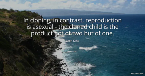 Kass, Leon. (2026, January 16). In cloning, in contrast, reproduction is asexual - the cloned child is the product not of two but of one. FixQuotes. https://fixquotes.com/quotes/in-cloning-in-contrast-reproduction-is-asexual--127611/