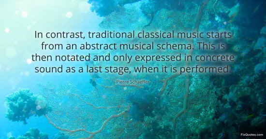 Schaeffer, Pierre. "In contrast, traditional classical music starts from an abstract musical schema. This is then notated and only expressed in concrete sound as a last stage, when it is performed." FixQuotes. January 15, 2026. https://fixquotes.com/quotes/in-contrast-traditional-classical-music-starts-89735/.