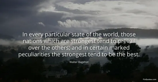 Bagehot, Walter. "In every particular state of the world, those nations which are strongest tend to prevail over the others; and in certain marked peculiarities the strongest tend to be the best." FixQuotes. January 15, 2026. https://fixquotes.com/quotes/in-every-particular-state-of-the-world-those-150189/.