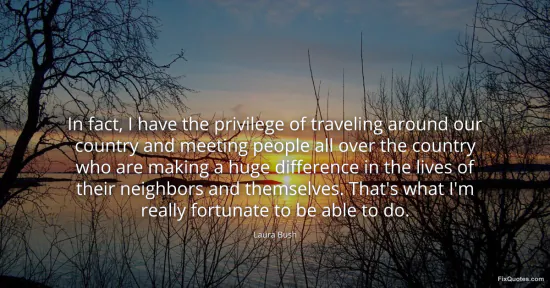 Bush, Laura. (2026, January 18). In fact, I have the privilege of traveling around our country and meeting people all over the country who are making a huge difference in the lives of their neighbors and themselves. That's what I'm really fortunate to be able to do. FixQuotes. https://fixquotes.com/quotes/in-fact-i-have-the-privilege-of-traveling-around-15636/
