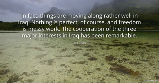 Linder, John. (2026, January 17). In fact, things are moving along rather well in Iraq. Nothing is perfect, of course, and freedom is messy work. The cooperation of the three major interests in Iraq has been remarkable. FixQuotes. https://fixquotes.com/quotes/in-fact-things-are-moving-along-rather-well-in-56593/