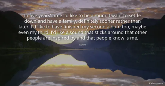 Adele. "In five years' time I'd like to be a mum. I want to settle down and have a family, definitely sooner rather than later. I'd like to have finished my second album too, maybe even my third. I'd like a sound that sticks around that other people are inspired by and that people know is me." FixQuotes. January 18, 2026. https://fixquotes.com/quotes/in-five-years-time-id-like-to-be-a-mum-i-want-to-22207/.