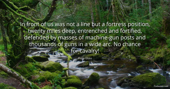 Gibbs, Philip. (2026, January 16). In front of us was not a line but a fortress position, twenty miles deep, entrenched and fortified, defended by masses of machine-gun posts and thousands of guns in a wide arc. No chance for cavalry! FixQuotes. https://fixquotes.com/quotes/in-front-of-us-was-not-a-line-but-a-fortress-91431/