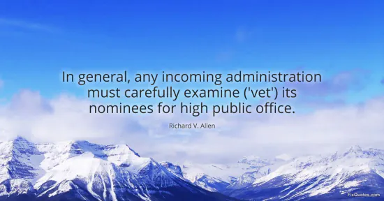 Vetting sounds like a procedural nicety, but in Richard V. Allen's hands it reads as a warning label. "In general" is the tell: a bureaucrat's throat-clearing that pretends neutrality while setting up a rule meant to be violated only at great cost. The parenthetical "('vet')" does double duty. It translates insider shorthand for outsiders, but it also narrows the meaning to a specific, quasi-clinical act: inspect, probe, certify. Not "consider" or "evaluate" - "vet" implies risk management, the assumption that something could be wrong and that finding it early is the point.