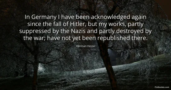 Hesse, Herman. (2026, January 17). In Germany I have been acknowledged again since the fall of Hitler, but my works, partly suppressed by the Nazis and partly destroyed by the war; have not yet been republished there. FixQuotes. https://fixquotes.com/quotes/in-germany-i-have-been-acknowledged-again-since-50739/