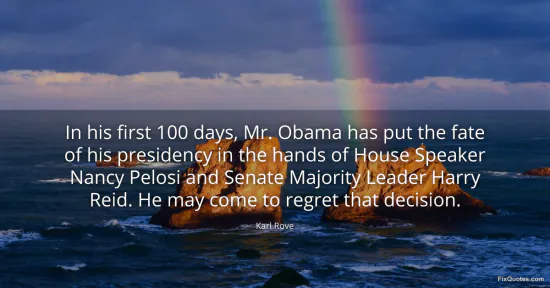 Rove, Karl. "In his first 100 days, Mr. Obama has put the fate of his presidency in the hands of House Speaker Nancy Pelosi and Senate Majority Leader Harry Reid. He may come to regret that decision." FixQuotes. January 16, 2026. https://fixquotes.com/quotes/in-his-first-100-days-mr-obama-has-put-the-fate-118683/.