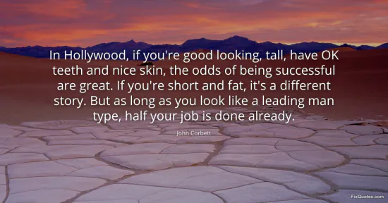 Corbett, John. "In Hollywood, if you're good looking, tall, have OK teeth and nice skin, the odds of being successful are great. If you're short and fat, it's a different story. But as long as you look like a leading man type, half your job is done already." FixQuotes. February 17, 2026. https://fixquotes.com/quotes/in-hollywood-if-youre-good-looking-tall-have-ok-118262/.