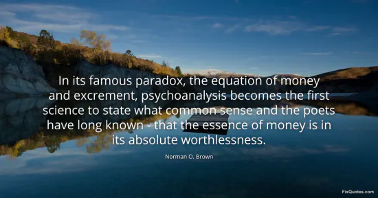 Brown, Norman O. "In its famous paradox, the equation of money and excrement, psychoanalysis becomes the first science to state what common sense and the poets have long known - that the essence of money is in its absolute worthlessness." FixQuotes. January 16, 2026. https://fixquotes.com/quotes/in-its-famous-paradox-the-equation-of-money-and-108714/.