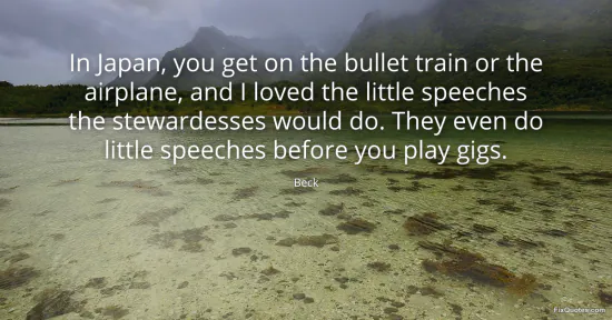 Beck. "In Japan, you get on the bullet train or the airplane, and I loved the little speeches the stewardesses would do. They even do little speeches before you play gigs." FixQuotes. January 17, 2026. https://fixquotes.com/quotes/in-japan-you-get-on-the-bullet-train-or-the-35588/.