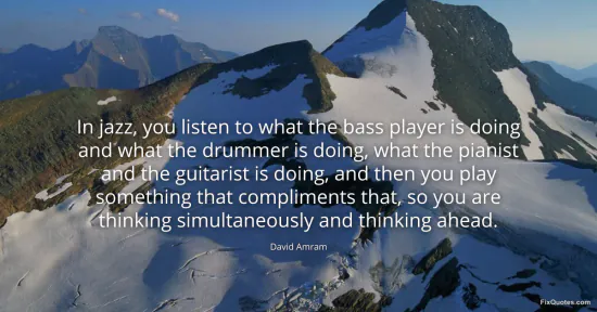 Amram, David. (2026, January 15). In jazz, you listen to what the bass player is doing and what the drummer is doing, what the pianist and the guitarist is doing, and then you play something that compliments that, so you are thinking simultaneously and thinking ahead. FixQuotes. https://fixquotes.com/quotes/in-jazz-you-listen-to-what-the-bass-player-is-147422/