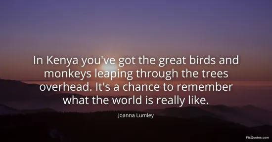 Lumley, Joanna. (2026, January 15). In Kenya you've got the great birds and monkeys leaping through the trees overhead. It's a chance to remember what the world is really like. FixQuotes. https://fixquotes.com/quotes/in-kenya-youve-got-the-great-birds-and-monkeys-155010/