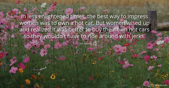 Adams, Scott. (2026, January 18). In less enlightened times, the best way to impress women was to own a hot car. But women wised up and realized it was better to buy their own hot cars so they wouldn't have to ride around with jerks. FixQuotes. https://fixquotes.com/quotes/in-less-enlightened-times-the-best-way-to-impress-15407/