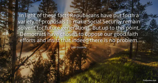 Doolittle, John. (2026, January 17). In light of these facts Republicans have put forth a variety of proposals to make Social Security remain solvent for future generations. But up to this point, Democrats have chosen to oppose our good faith efforts and insist that indeed there is no problem. FixQuotes. https://fixquotes.com/quotes/in-light-of-these-facts-republicans-have-put-68027/