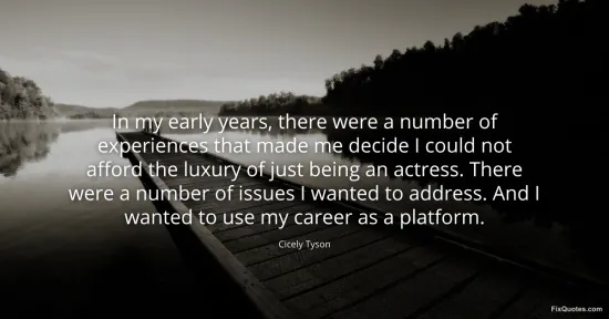 Tyson, Cicely. "In my early years, there were a number of experiences that made me decide I could not afford the luxury of just being an actress. There were a number of issues I wanted to address. And I wanted to use my career as a platform." FixQuotes. January 16, 2026. https://fixquotes.com/quotes/in-my-early-years-there-were-a-number-of-130868/.