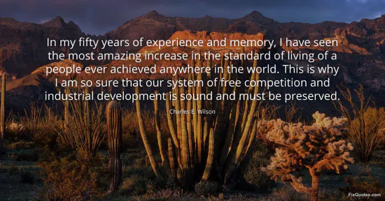Wilson, Charles E. "In my fifty years of experience and memory, I have seen the most amazing increase in the standard of living of a people ever achieved anywhere in the world. This is why I am so sure that our system of free competition and industrial development is sound and must be preserved." FixQuotes. January 17, 2026. https://fixquotes.com/quotes/in-my-fifty-years-of-experience-and-memory-i-have-44594/.