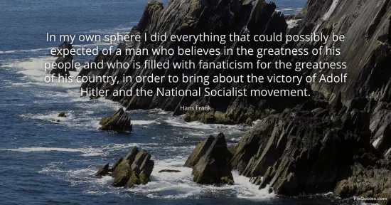 Frank, Hans. (2026, January 17). In my own sphere I did everything that could possibly be expected of a man who believes in the greatness of his people and who is filled with fanaticism for the greatness of his country, in order to bring about the victory of Adolf Hitler and the National Socialist movement. FixQuotes. https://fixquotes.com/quotes/in-my-own-sphere-i-did-everything-that-could-55320/