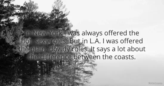 Neuwirth, Bebe. "In New York I was always offered the hot, sexy roles. But in L.A. I was offered the plain, dowdy roles. It says a lot about the difference between the coasts." FixQuotes. January 15, 2026. https://fixquotes.com/quotes/in-new-york-i-was-always-offered-the-hot-sexy-167025/.