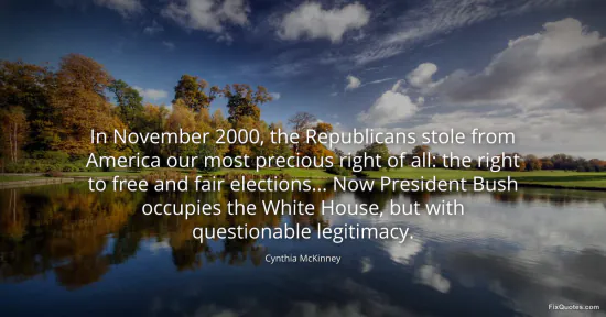 McKinney, Cynthia. (2026, January 16). In November 2000, the Republicans stole from America our most precious right of all: the right to free and fair elections... Now President Bush occupies the White House, but with questionable legitimacy. FixQuotes. https://fixquotes.com/quotes/in-november-2000-the-republicans-stole-from-87736/