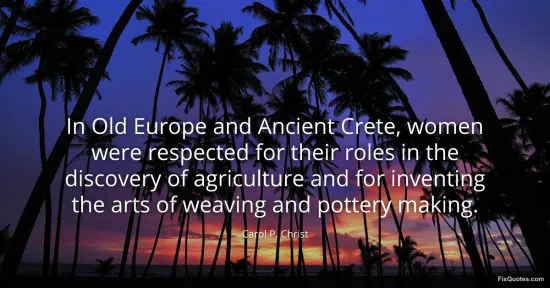 Christ, Carol P. (2026, January 17). In Old Europe and Ancient Crete, women were respected for their roles in the discovery of agriculture and for inventing the arts of weaving and pottery making. FixQuotes. https://fixquotes.com/quotes/in-old-europe-and-ancient-crete-women-were-45701/