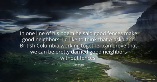 Miller, Dan. (2026, January 16). In one line of his poem he said good fences make good neighbors. I'd like to think that Alaska and British Columbia working together can prove that we can be pretty darned good neighbors without fences. FixQuotes. https://fixquotes.com/quotes/in-one-line-of-his-poem-he-said-good-fences-make-111487/