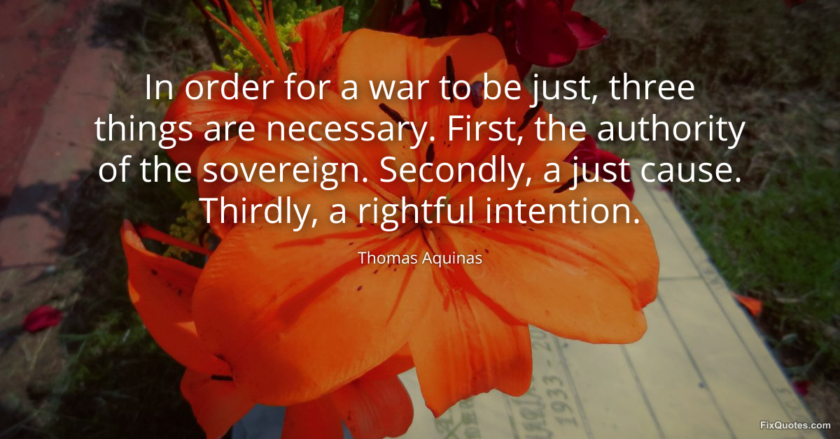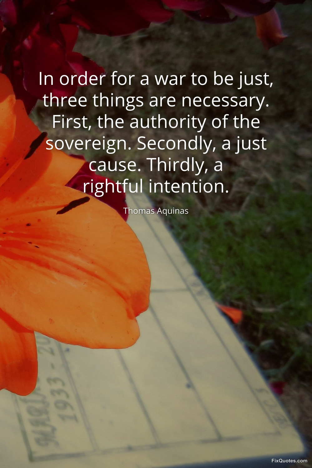 Aquinas, Thomas. "In order for a war to be just, three things are necessary. First, the authority of the sovereign. Secondly, a just cause. Thirdly, a rightful intention." FixQuotes. March 1, 2026. https://fixquotes.com/quotes/in-order-for-a-war-to-be-just-three-things-are-10280/.
