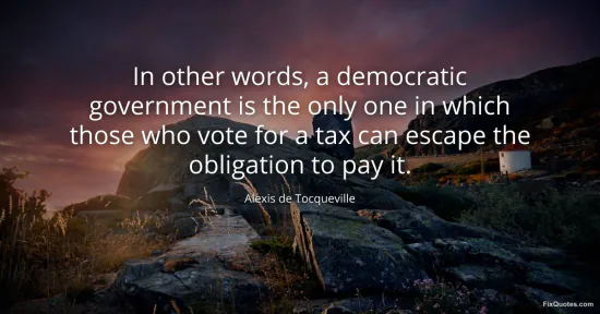 Tocqueville, Alexis de. "In other words, a democratic government is the only one in which those who vote for a tax can escape the obligation to pay it." FixQuotes. January 18, 2026. https://fixquotes.com/quotes/in-other-words-a-democratic-government-is-the-16717/.