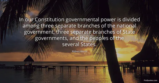 Welch, Robert. (2026, January 16). In our Constitution governmental power is divided among three separate branches of the national government, three separate branches of State governments, and the peoples of the several States. FixQuotes. https://fixquotes.com/quotes/in-our-constitution-governmental-power-is-divided-94726/