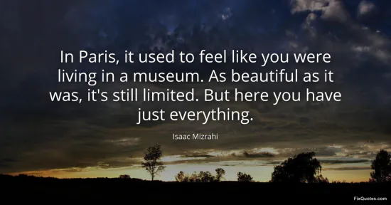 Mizrahi, Isaac. (2026, January 17). In Paris, it used to feel like you were living in a museum. As beautiful as it was, it's still limited. But here you have just everything. FixQuotes. https://fixquotes.com/quotes/in-paris-it-used-to-feel-like-you-were-living-in-24390/