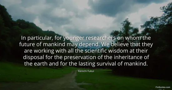 Fukui, Kenichi. (2026, January 16). In particular, for younger researchers on whom the future of mankind may depend. We believe that they are working with all the scientific wisdom at their disposal for the preservation of the inheritance of the earth and for the lasting survival of mankind. FixQuotes. https://fixquotes.com/quotes/in-particular-for-younger-researchers-on-whom-the-111842/