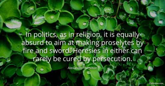 Hamilton, Alexander. (2026, January 15). In politics, as in religion, it is equally absurd to aim at making proselytes by fire and sword. Heresies in either can rarely be cured by persecution. FixQuotes. https://fixquotes.com/quotes/in-politics-as-in-religion-it-is-equally-absurd-25673/