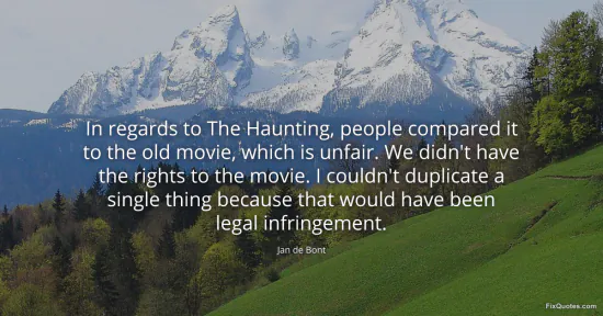 Bont, Jan de. (2026, January 16). In regards to The Haunting, people compared it to the old movie, which is unfair. We didn't have the rights to the movie. I couldn't duplicate a single thing because that would have been legal infringement. FixQuotes. https://fixquotes.com/quotes/in-regards-to-the-haunting-people-compared-it-to-133059/