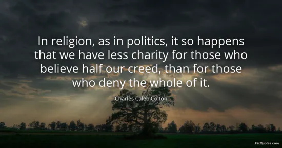 Colton, Charles Caleb. (2026, February 18). In religion, as in politics, it so happens that we have less charity for those who believe half our creed, than for those who deny the whole of it. FixQuotes. https://fixquotes.com/quotes/in-religion-as-in-politics-it-so-happens-that-we-85654/