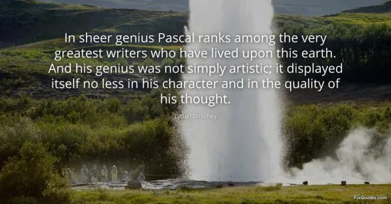 Strachey, Lytton. "In sheer genius Pascal ranks among the very greatest writers who have lived upon this earth. And his genius was not simply artistic; it displayed itself no less in his character and in the quality of his thought." FixQuotes. January 16, 2026. https://fixquotes.com/quotes/in-sheer-genius-pascal-ranks-among-the-very-127645/.