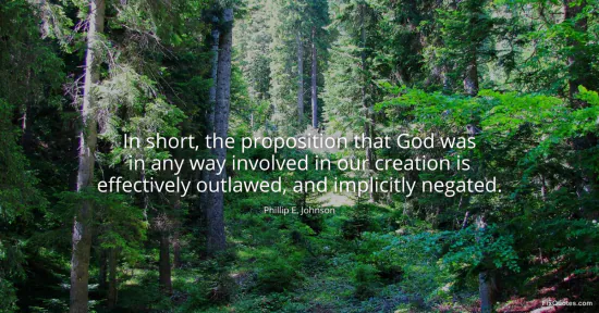 Johnson, Phillip E. "In short, the proposition that God was in any way involved in our creation is effectively outlawed, and implicitly negated." FixQuotes. January 15, 2026. https://fixquotes.com/quotes/in-short-the-proposition-that-god-was-in-any-way-151169/.