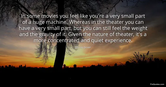 Driver, Minnie. "In some movies you feel like you're a very small part of a huge machine. Whereas in the theater you can have a very small part, but you can still feel the weight and the gravity of it. Given the nature of theater, it's a more concentrated and quiet experience." FixQuotes. January 16, 2026. https://fixquotes.com/quotes/in-some-movies-you-feel-like-youre-a-very-small-120394/.