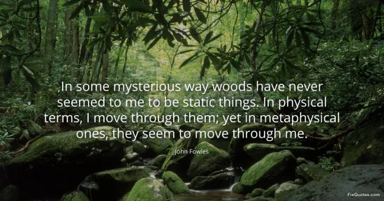 Fowles, John. "In some mysterious way woods have never seemed to me to be static things. In physical terms, I move through them; yet in metaphysical ones, they seem to move through me." FixQuotes. January 15, 2026. https://fixquotes.com/quotes/in-some-mysterious-way-woods-have-never-seemed-to-147163/.