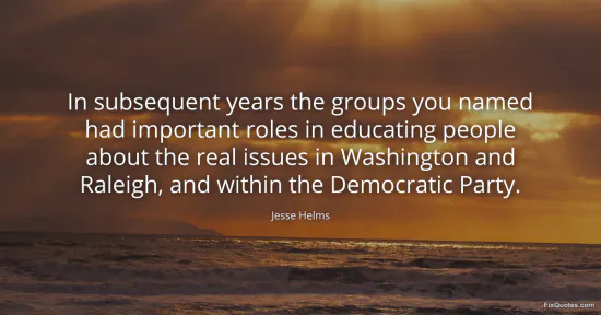 The key move is the phrase “the groups you named.” It withholds the groups’ identities, turning them into a generic category - a maneuver that can flatten complex coalitions into a single, manageable “they.” Then comes the loaded geography: Washington and Raleigh. Helms isn’t talking about abstract politics; he’s pointing to the power centers where agenda-setting happens. To “educate” about “real issues” is to frame politics as a remedial lesson taught to a misled public, implying the public has been distracted by the wrong priorities (civil rights enforcement, federal intervention, “liberal” social policy) and needs correction.