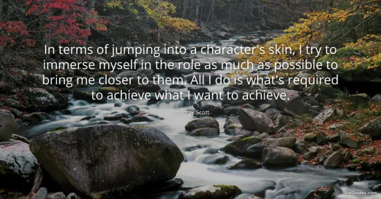 Scott, Dougray. "In terms of jumping into a character's skin, I try to immerse myself in the role as much as possible to bring me closer to them. All I do is what's required to achieve what I want to achieve." FixQuotes. January 17, 2026. https://fixquotes.com/quotes/in-terms-of-jumping-into-a-characters-skin-i-try-48627/.