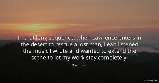 Jarre, Maurice. "In that long sequence, when Lawrence enters in the desert to rescue a lost man, Lean listened the music I wrote and wanted to extend the scene to let my work stay completely." FixQuotes. January 15, 2026. https://fixquotes.com/quotes/in-that-long-sequence-when-lawrence-enters-in-the-57409/.