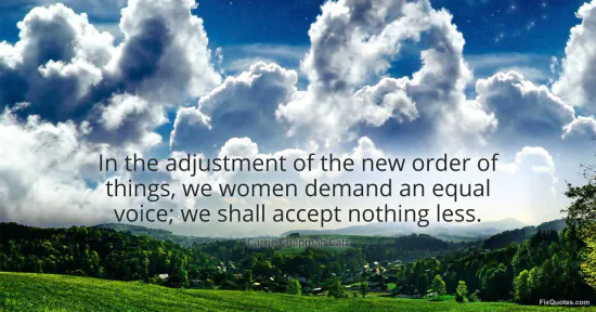Catt, Carrie Chapman. (2026, January 16). In the adjustment of the new order of things, we women demand an equal voice; we shall accept nothing less. FixQuotes. https://fixquotes.com/quotes/in-the-adjustment-of-the-new-order-of-things-we-109678/