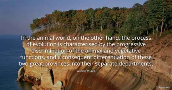 Wundt, Wilhelm. "In the animal world, on the other hand, the process of evolution is characterised by the progressive discrimination of the animal and vegetative functions, and a consequent differentiation of these two great provinces into their separate departments." FixQuotes. January 17, 2026. https://fixquotes.com/quotes/in-the-animal-world-on-the-other-hand-the-process-78274/.
