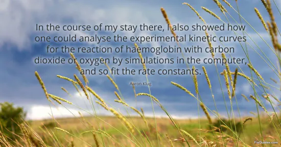 Klug, Aaron. "In the course of my stay there, I also showed how one could analyse the experimental kinetic curves for the reaction of haemoglobin with carbon dioxide or oxygen by simulations in the computer, and so fit the rate constants." FixQuotes. January 16, 2026. https://fixquotes.com/quotes/in-the-course-of-my-stay-there-i-also-showed-how-113826/.
