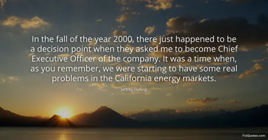 Skilling, Jeffrey. "In the fall of the year 2000, there just happened to be a decision point when they asked me to become Chief Executive Officer of the company. It was a time when, as you remember, we were starting to have some real problems in the California energy markets." FixQuotes. January 16, 2026. https://fixquotes.com/quotes/in-the-fall-of-the-year-2000-there-just-happened-119506/.