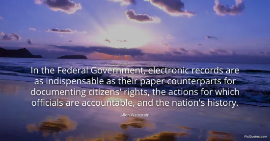 Weinstein, Allen. "In the Federal Government, electronic records are as indispensable as their paper counterparts for documenting citizens' rights, the actions for which officials are accountable, and the nation's history." FixQuotes. January 15, 2026. https://fixquotes.com/quotes/in-the-federal-government-electronic-records-are-46056/.
