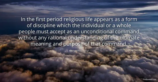 Iqbal, Muhammed. "In the first period religious life appears as a form of discipline which the individual or a whole people must accept as an unconditional command without any rational understanding of the ultimate meaning and purpose of that command." FixQuotes. January 17, 2026. https://fixquotes.com/quotes/in-the-first-period-religious-life-appears-as-a-82228/.