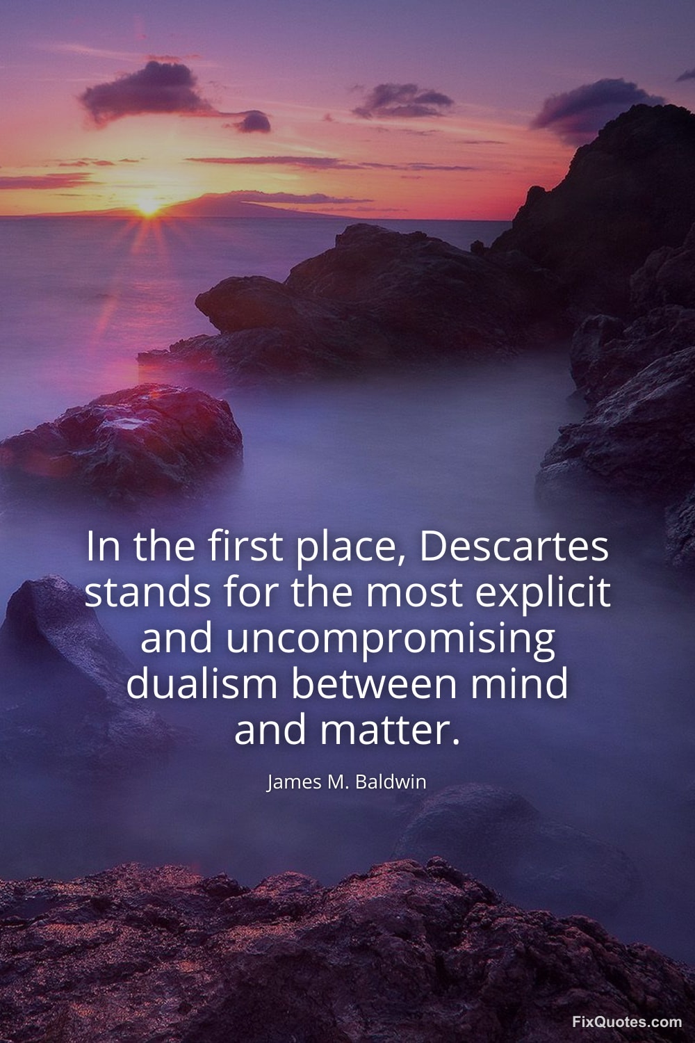 Baldwin, James M. "In the first place, Descartes stands for the most explicit and uncompromising dualism between mind and matter." FixQuotes. January 16, 2026. https://fixquotes.com/quotes/in-the-first-place-descartes-stands-for-the-most-102341/.