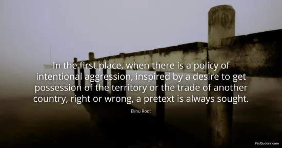 Root, Elihu. "In the first place, when there is a policy of intentional aggression, inspired by a desire to get possession of the territory or the trade of another country, right or wrong, a pretext is always sought." FixQuotes. January 17, 2026. https://fixquotes.com/quotes/in-the-first-place-when-there-is-a-policy-of-53014/.