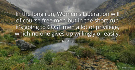 Morgan, Robin. "In the long run, Women's Liberation will of course free men-but in the short run it's going to COST men a lot of privilege, which no one gives up willingly or easily." FixQuotes. January 15, 2026. https://fixquotes.com/quotes/in-the-long-run-womens-liberation-will-of-course-164489/.