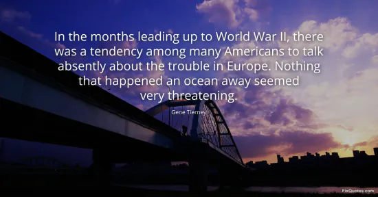 Tierney, Gene. "In the months leading up to World War II, there was a tendency among many Americans to talk absently about the trouble in Europe. Nothing that happened an ocean away seemed very threatening." FixQuotes. January 17, 2026. https://fixquotes.com/quotes/in-the-months-leading-up-to-world-war-ii-there-60046/.